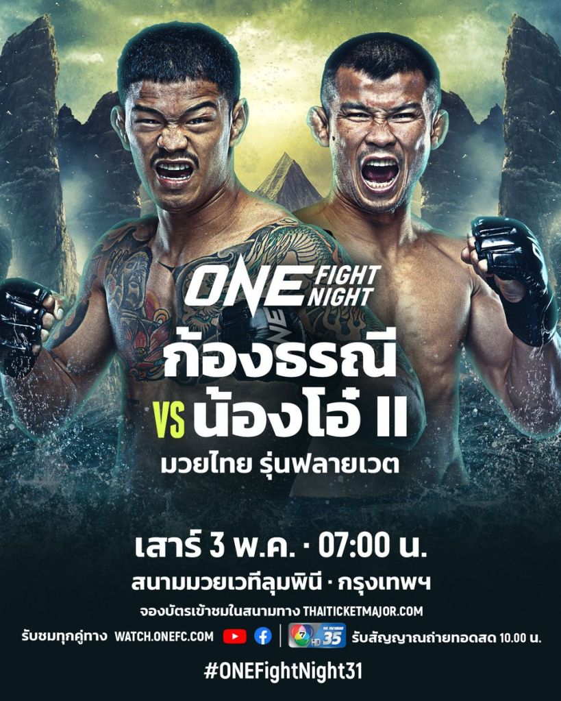 เปิดคู่เอกสุดเดือดในศึก ONE Fight Night 31 ที่พร้อมมอบความมันให้กับผู้ชมใน 195 ประเทศทั่วโลก จากเวทีลุมพินี (รามอินทรา) ในช่วงไพรม์ไทม์อเมริกา ซึ่งตรงกับช่วงเช้าเวลา 07:00 น. ของวันเสาร์ที่ 3 พ.ค.นี้ โดยประกบให้ ‘ก้องธรณี ส.สมหมาย’ เจ้าของตำแหน่งผู้ท้าชิงอันดับ 3 ของแรงกิง ONE มวยไทย รุ่นฟลายเวต (125-135 ป.) พบกับคู่ปรับหน้าเดิม ‘น้องโอ๋ ฮาม่ามวยไทย’ อดีตแชมป์โลก ONE มวยไทย รุ่นแบนตัมเวต (135-145 ป.) ในกติกามวยไทย รุ่นฟลายเวต